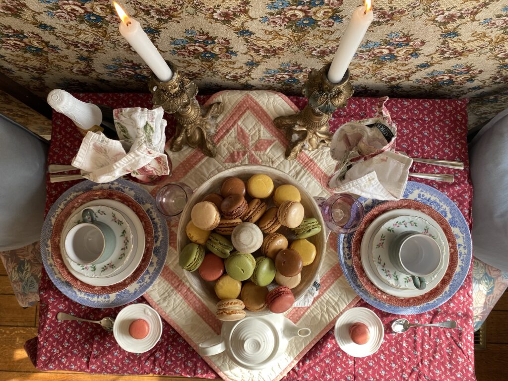 Choose a charming spot in your home. It can be the dining table or even outside, if the weather is on your side! Layer a variety of linens to cover your table. You can mix and match whatever you have on hand. One of my favorite places to find linens is the thrift store or estate sales. There are always truly unique pieces there! I love to choose a pattern, as these can hide unforgivable stains.